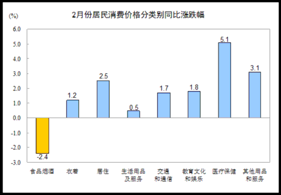 2月份,食品煙酒價格同比下降2.4%,影響CPI下降約0.74個百分點。其中,鮮菜價格下降26.0%,影響CPI下降約0.94個百分點;蛋價格下降14.9%,影響CPI下降約0.09個百分點;畜肉類價格下降0.1%(豬肉價格下降0.9%,影響CPI下降約0.03個百分點);水產(chǎn)品價格上漲2.2%,影響CPI上漲約0.04個百分點;鮮果價格上漲2.1%,影響CPI上漲約0.04個百分點;糧食價格上漲1.2%,影響CPI上漲約0.02個百分點。