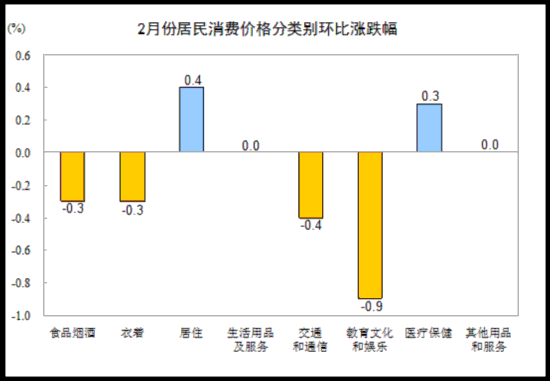 2月份,全國居民消費價格總水平環(huán)比下降0.2%。其中,城市下降0.2%,農(nóng)村下降0.1%;食品價格下降0.6%,非食品價格下降0.1%;消費品價格下降0.1%,服務(wù)價格下降0.3%。