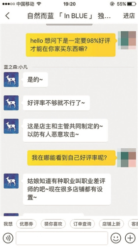 一家名為“自然而藍”的店鋪主營服裝類商品,北青報記者以顧客身份進行詢問,客服稱,買家發(fā)出的好評率要在98%以上,才可以在店中購買!昂迷u率不夠就不行了,這也是店主和主管共同制定的,以防有人惡意攻擊!笨头藛T稱,目前有很多家店鋪都有類似設(shè)置,“因為有種行當(dāng)叫職業(yè)差評師,所以很多家店鋪都會設(shè)置,只是標(biāo)準(zhǔn)不一樣,算是不成文的規(guī)矩!