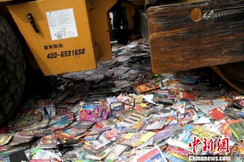資料圖:侵權(quán)盜版及非法出版物銷(xiāo)毀現(xiàn)場(chǎng)。田進(jìn) 攝
