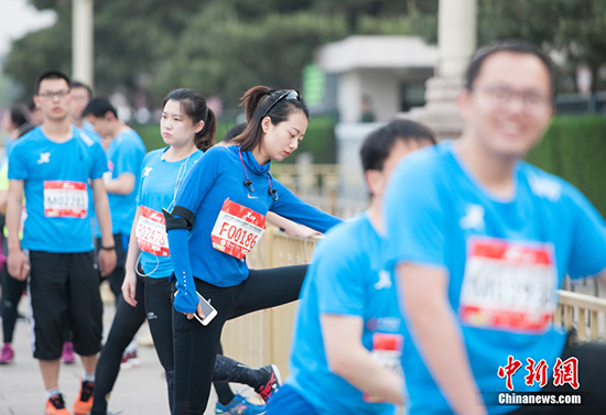 賽前跑友做準(zhǔn)備活動(dòng) 中新網(wǎng)記者 李卿 攝