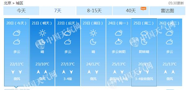 今天北京將是晴到多云的天氣,氣溫將有所回升。北京市氣象臺預(yù)計,今天白天晴轉(zhuǎn)多云,山區(qū)有小陣雨,北轉(zhuǎn)南風(fēng)二三級,最高氣溫22℃。夜間多云間晴,南轉(zhuǎn)北風(fēng)二三級,最低氣溫10℃。