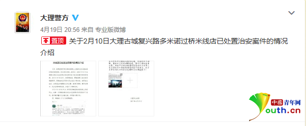 中國(guó)青年網(wǎng)北京4月20日電 (見(jiàn)習(xí)記者 劉利影) 4月19日,一則“大理古城復(fù)興路老板與游客發(fā)生肢體沖突”的視頻在微博上傳播。4月19日晚,大理市公安局通過(guò)官方微博發(fā)布情況通報(bào)稱,網(wǎng)傳視頻系2月10日大理古城米線店因糾紛引發(fā)治安案件的現(xiàn)場(chǎng)視頻,游客因食鹽味淡與店主發(fā)生口角后雙方扯打在一起,案件處理中雙方已和解并簽訂調(diào)解協(xié)議。