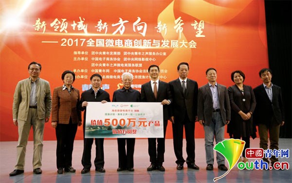 團(tuán)中央“青年之聲”微電商服務(wù)聯(lián)盟副主席、海名微微電商平臺(tái)總裁、新西蘭紐西之謎中國(guó)區(qū)首席代表劉曉坤(左五)向北京授漁計(jì)劃公益促進(jìn)中心捐贈(zèng)海名微公司價(jià)值500萬(wàn)元產(chǎn)品,授漁計(jì)劃公益促進(jìn)中心秘書長(zhǎng)高繼輝(左三)接受捐贈(zèng)。左四為十一屆全國(guó)人大常委會(huì)副委員長(zhǎng)周鐵農(nóng)。中國(guó)青年網(wǎng)記者李鐵攝