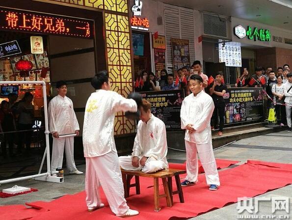 央廣網(wǎng)深圳4月29日消息(記者 于揚(yáng))在深圳真有鐵頭功!而且這位高手就藏在深圳的東門(mén),他可以倒立在一根堅(jiān)硬的鐵釘上數(shù)十分鐘,他就是鄭衛(wèi)勇。在之前香港舉行的“感恩杯”第十屆香港國(guó)際武術(shù)大賽上,他表演頭頂鐵釘?shù)沽,預(yù)計(jì)表演80分鐘,但第40分鐘時(shí),裁判員已經(jīng)激動(dòng)地宣布他獲得了冠軍!記者近日也用鏡頭紀(jì)錄了他令人咋舌的“功力”——倒立在一根堅(jiān)硬的鐵釘上,頭部把釘在木板上的鐵釘壓彎!