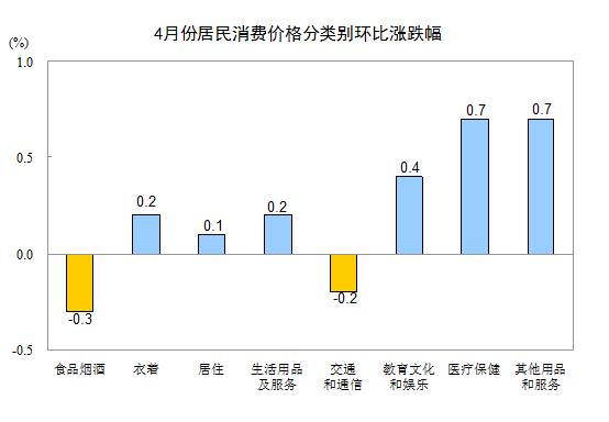 4月份,全國(guó)居民消費(fèi)價(jià)格總水平環(huán)比上漲0.1%。其中,城市上漲0.1%,農(nóng)村持平;食品價(jià)格下降0.6%,非食品價(jià)格上漲0.2%;消費(fèi)品價(jià)格下降0.1%,服務(wù)價(jià)格上漲0.4%。