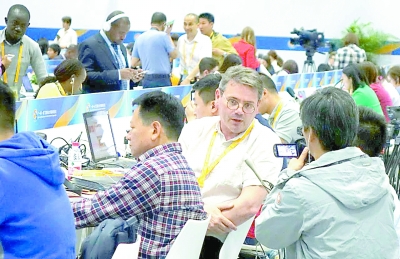 高峰論壇期間,媒體同行之間相互采訪,交流報(bào)道心得和對論壇的印象。光明日報(bào)記者 郭紅松攝/光明圖片