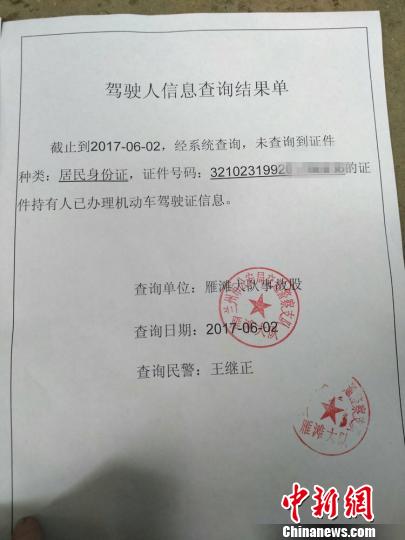 經(jīng)上網(wǎng)核查嫌疑人為無照駕駛。 交警部門提供 攝