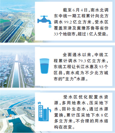 保生態(tài),不合理用水結(jié)構(gòu)在變。南水來(lái)了,多用地表水、壓采地下水、回補(bǔ)生態(tài)水,受水區(qū)優(yōu)化配置水資源,通過(guò)水源置換,累計(jì)壓采地下水8億多立方米。北京“喝存補(bǔ)”并舉,河湖水質(zhì)明顯改善;天津用南水置換出生態(tài)用水,變應(yīng)急補(bǔ)水為常態(tài)補(bǔ)水,海河水生態(tài)有了保障;山東向東平湖、南四湖生態(tài)調(diào)水2億立方米,干渴的湖泊重現(xiàn)生機(jī)。