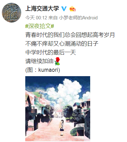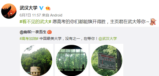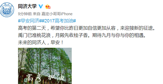 人民網(wǎng)北京6月8日電 一年一度的高考鐘聲已于昨日再次在全國(guó)各地敲響,940萬(wàn)考生在火熱的六月迎戰(zhàn)生命中一場(chǎng)重要的考驗(yàn)。值此之際,北京大學(xué)、人民大學(xué)、復(fù)旦大學(xué)、武漢大學(xué)等高校紛紛通過(guò)官方微博為高考考生獻(xiàn)上祝福和鼓勵(lì):愿你沉著自信奔赴戰(zhàn)場(chǎng),祝你旗開(kāi)得勝金榜題名,我們?cè)诖髮W(xué)等你!