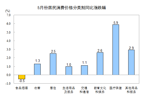 5月份,其他七大類價(jià)格同比均有所上漲。其中,醫(yī)療保健價(jià)格上漲5.9%,其他用品和服務(wù)價(jià)格上漲2.9%,教育文化和娛樂價(jià)格上漲2.6%,居住價(jià)格上漲2.5%,衣著、交通和通信、生活用品及服務(wù)價(jià)格分別上漲1.3%、1.1%和1.0%。