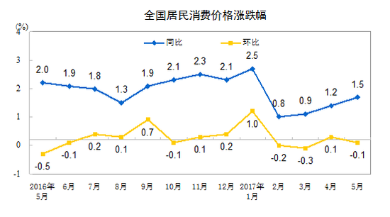 。ㄔ瓨(biāo)題:2017年5月份居民消費(fèi)價(jià)格同比上漲1.5%)