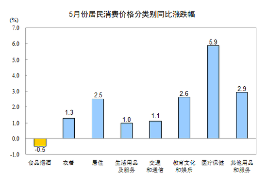 5月份,其他七大類價(jià)格同比均有所上漲。其中,醫(yī)療保健價(jià)格上漲5.9%,其他用品和服務(wù)價(jià)格上漲2.9%,教育文化和娛樂價(jià)格上漲2.6%,居住價(jià)格上漲2.5%,衣著、交通和通信、生活用品及服務(wù)價(jià)格分別上漲1.3%、1.1%和1.0%。