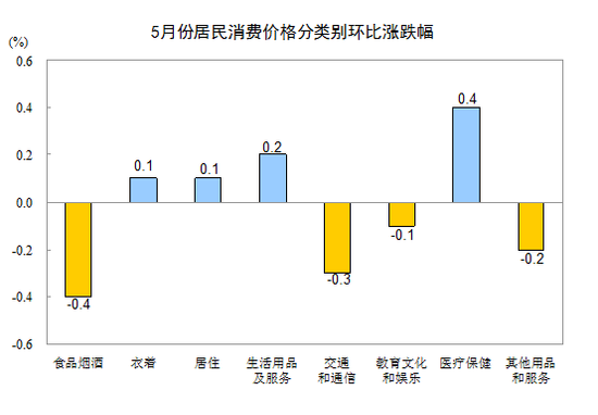 5月份,全國(guó)居民消費(fèi)價(jià)格總水平環(huán)比下降0.1%。其中,城市下降0.1%,農(nóng)村下降0.1%;食品價(jià)格下降0.7%,非食品價(jià)格持平;消費(fèi)品價(jià)格下降0.2%,服務(wù)價(jià)格上漲0.1%。