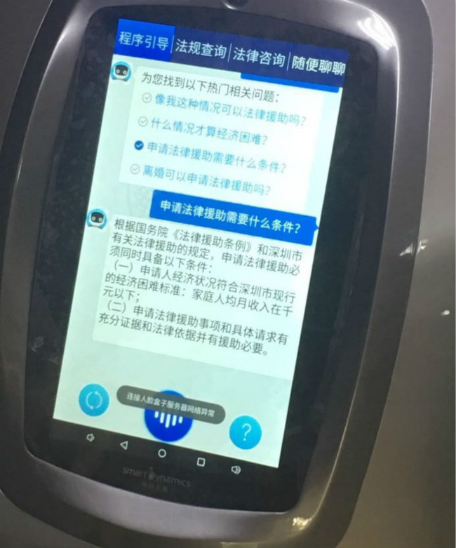"龍華小法"法律援助機器人高1.48米,云端存儲10萬余條法律法規(guī)、3萬個典型案例數(shù)據(jù)、5000多條案情分析點及海量專業(yè)問答信息,F(xiàn)已具有“申請援助、援助審查、援助實施、法律咨詢、申請支付令、交通事故、熱點問題及其他”八大服務功能。不僅可幫助解決公眾工作生活中經(jīng)常遇到的法律問題,更可24小時通過“援助實施”模塊與法援中心當值律師實現(xiàn)音視頻連接,解決其個性化法律問題。