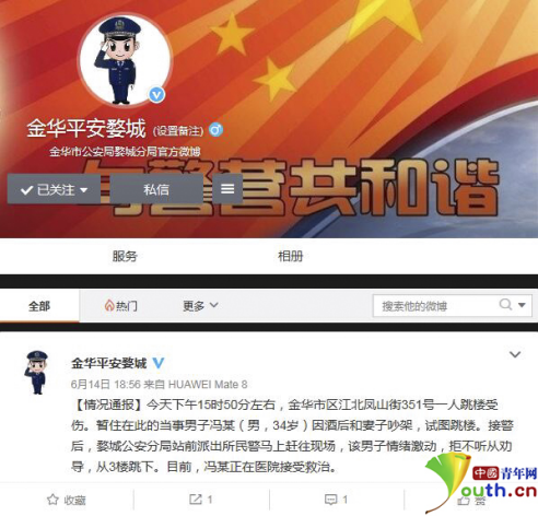 6月14日晚,浙江省金華市公安局婺城分局官方微博通報(bào)此事,稱暫住在此的當(dāng)事男子馮某(男,34歲)因酒后和妻子吵架,試圖跳樓。接警后,婺城公安分局站前派出所民警馬上趕往現(xiàn)場(chǎng),該男子情緒激動(dòng),拒不聽從勸導(dǎo),從3樓跳下。目前,馮某正在醫(yī)院接受救治。