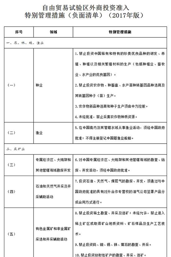 《自由貿(mào)易試驗(yàn)區(qū)外商投資準(zhǔn)入特別管理措施(負(fù)面清單)(2017年版)》全文: