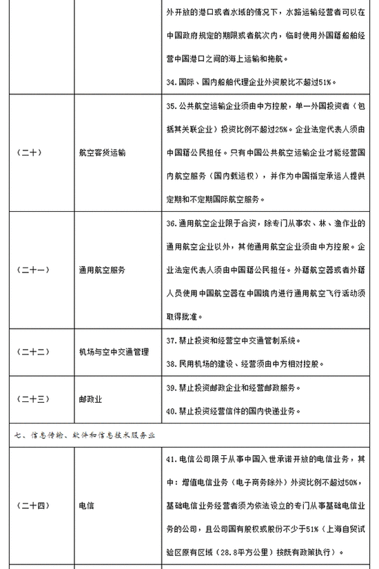 6月16日,國務(wù)院辦公廳印發(fā)新版《自由貿(mào)易試驗(yàn)區(qū)外商投資準(zhǔn)入特別管理措施(負(fù)面清單)》,此次修訂進(jìn)一步放寬外商投資準(zhǔn)入,新版自貿(mào)區(qū)負(fù)面清單內(nèi)容劃分為15個(gè)門類、40個(gè)條目、95項(xiàng)特別管理措施,與2015年版相比,減少了10個(gè)條目、27項(xiàng)措施。其中,減少的條目包括軌道交通設(shè)備制造、醫(yī)藥制造、道路運(yùn)輸、保險(xiǎn)業(yè)務(wù)、會(huì)計(jì)審計(jì)、其他商務(wù)服務(wù)等6條,同時(shí)整合減少了4條。