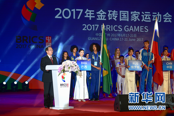 6月17日,2017年金磚國家運動會在廣州開幕,國家主席習(xí)近平致賀信,對運動會的召開表示熱烈祝賀,向參加運動會的各國嘉賓、運動員、教練員們致以誠摯的歡迎。國家體育總局局長茍仲文在開幕式上宣讀了習(xí)近平主席的賀信。新華社記者 劉大偉 攝