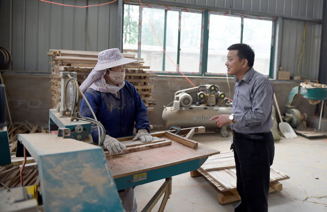 這是安徽省霍邱縣長(zhǎng)集鎮(zhèn)七里棚村第一書記羅煒(右)正在查看村內(nèi)的家具廠生產(chǎn)情況(5月23日攝)。新華社記者 郭晨 攝