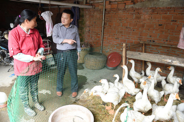 這是安徽省霍邱縣長(zhǎng)集鎮(zhèn)七里棚村第一書記羅煒(右)正在查看村民謝文會(huì)家的養(yǎng)鴨情況(5月23日攝)。新華社記者 郭晨 攝