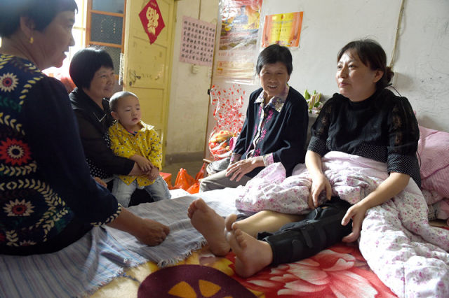 這是安徽省黃山市新譚鎮(zhèn)上資村的村民們前來(lái)看望前不久從電動(dòng)車上不慎摔下的該村第一書記黃艷艷(右一)(5月26日攝)。新華社記者 郭晨 攝