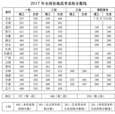 2017年全國部分地區(qū)高考錄取分數(shù)線