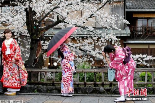 日本京都櫻花爛漫,民眾穿和服賞景。