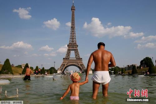 法國巴黎,人們在埃菲爾鐵塔前的TROCADERO廣場上玩水,以躲避高溫。