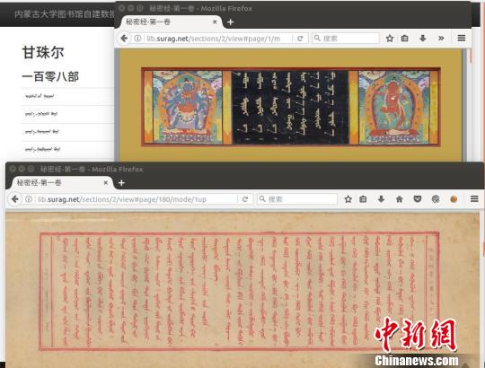 圖為1720年御制北京木刻版蒙古文《甘珠爾》經(jīng)的數(shù)字化成果,先登錄內(nèi)蒙古大學蒙古文數(shù)字圖書館即可查看。 內(nèi)蒙古大學圖書館 攝