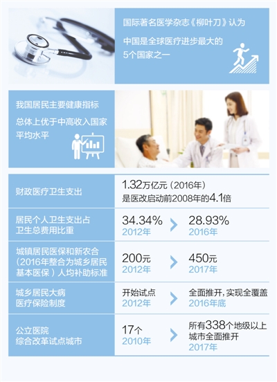 5年來,我國健康水平持續(xù)改善,居民主要健康指標總體上優(yōu)于中高收入國家平均水平,人均期望壽命從2010年的74.83歲上升至2016年的76.34歲。較高的健康績效,為全面建成小康社會奠定了重要基礎。世界銀行、世界衛(wèi)生組織認為,中國在實現(xiàn)全民健康覆蓋方面迅速邁進,改革成就舉世矚目。