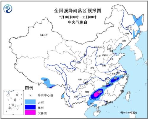 全國強(qiáng)降雨落區(qū)預(yù)報(bào)圖(7月10日08時(shí)-11日08時(shí))
