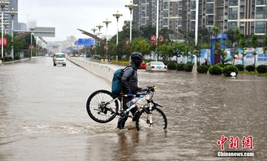 7月22日,民眾抬著自行車從積水路上走過。當(dāng)日,昆明持續(xù)降雨,城區(qū)多處路段積水。昆明市氣象臺(tái)發(fā)布暴雨藍(lán)色預(yù)警,未來12小時(shí)昆明市區(qū)及周邊多地區(qū)將持續(xù)降雨。 中新社記者 任東 攝