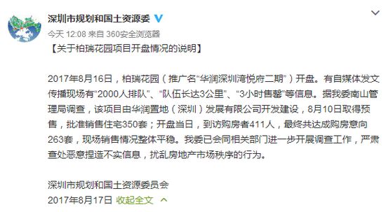 8月16日,柏瑞花園(推廣名“華潤(rùn)深圳灣悅府二期”)開(kāi)盤(pán)。有自媒體發(fā)文傳播現(xiàn)場(chǎng)有“2000人排隊(duì)”、“隊(duì)伍長(zhǎng)達(dá)3公里”、“3小時(shí)售罄”等信息。據(jù)深圳市規(guī)劃和國(guó)土資源委員會(huì)南山管理局調(diào)查,該項(xiàng)目由華潤(rùn)置地(深圳)發(fā)展有限公司開(kāi)發(fā)建設(shè),8月10日取得預(yù)售,批準(zhǔn)銷(xiāo)售住宅350套;開(kāi)盤(pán)當(dāng)日,到訪購(gòu)房者411人,最終共達(dá)成購(gòu)房意向263套,現(xiàn)場(chǎng)銷(xiāo)售情況整體平穩(wěn)。深圳市規(guī)劃和國(guó)土資源委員會(huì)已會(huì)同相關(guān)部門(mén)進(jìn)一步開(kāi)展調(diào)查工作,嚴(yán)肅查處惡意捏造不實(shí)信息,擾亂房地產(chǎn)市場(chǎng)秩序的行為。
