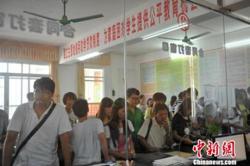 資料圖:2017年8月,學生和家長在廣西大化縣教育局資助辦申請助學貸款。 洪堅鵬 攝
