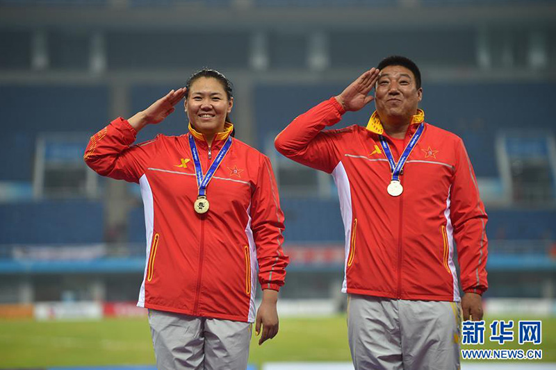 這是獲得女子鏈球冠軍的老將張文秀(左)和教練在頒獎儀式上(9月6日攝)。
