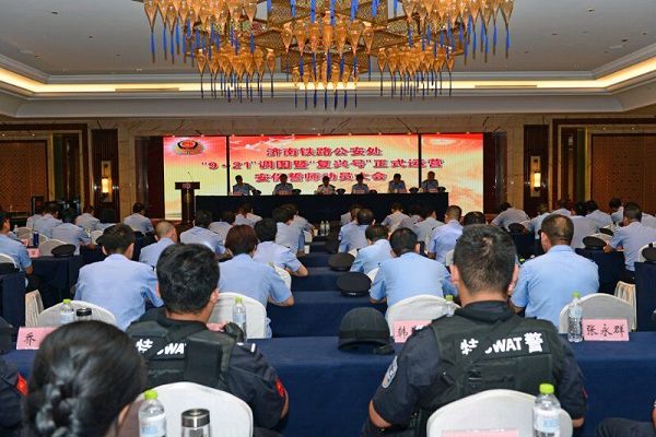 央廣網(wǎng)濟(jì)南9月21日消息(記者于聞 通訊員 張弦)“復(fù)興號(hào)”標(biāo)準(zhǔn)動(dòng)車組9月21日在京滬高鐵正式運(yùn)營(yíng),率先達(dá)到350公里時(shí)速。為確!皬(fù)興號(hào)”的運(yùn)營(yíng)安全,濟(jì)南鐵路公安處提前布局,在泰安召開(kāi)“9·21”調(diào)圖暨“復(fù)興號(hào)”正式運(yùn)營(yíng)安保誓師動(dòng)員大會(huì),濟(jì)南西站派出所干警代表共20人參加了動(dòng)員大會(huì)。大會(huì)號(hào)召全體干警繼續(xù)保持高昂的斗志,不惜一切代價(jià),集中全部精力,戰(zhàn)勝一切困難,確!皬(fù)興號(hào)”正式運(yùn)營(yíng)的絕對(duì)安全。大會(huì)舉行了安保誓師動(dòng)員集體宣誓儀式。