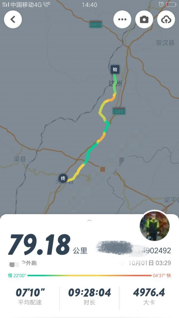 王浪:跑之前看地圖顯示73公里左右,預(yù)計步行需要17個小時多。但我用跑步軟件記錄的,從學(xué)校到大竹縣雙馬車站,跑了79.18公里,總計花了9個小時28分,包括了中途休息、補充能量所需的時間。