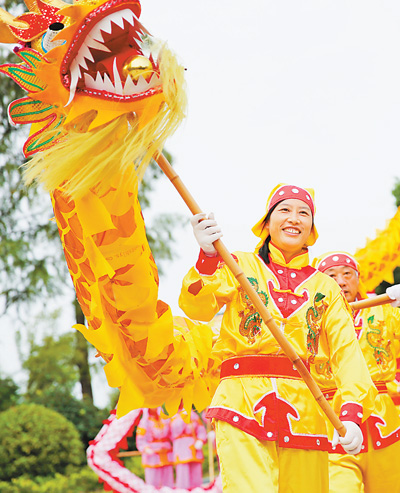 10月4日,舞龍隊(duì)成員在江蘇南通市嗇園進(jìn)行傳統(tǒng)民俗舞龍表演,歡度中秋佳節(jié)。