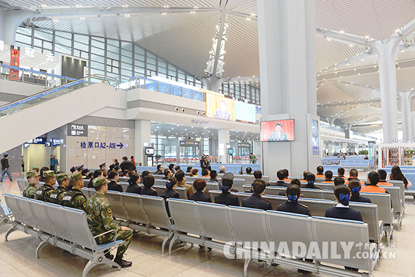 10月18日,山西太原南站組織駐地武警、鐵路公安、間休工作人員,以及候車旅客共同收看十九大開幕會。