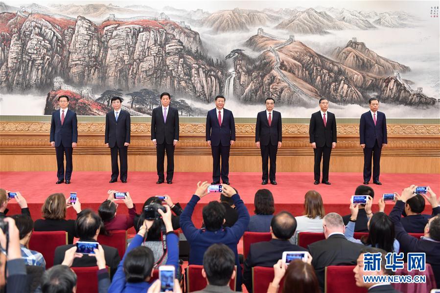 10月25日,剛剛在中共十九屆一中全會上當(dāng)選的中共中央總書記習(xí)近平和中央政治局常委李克強、栗戰(zhàn)書、汪洋、王滬寧、趙樂際、韓正在北京人民大會堂同采訪十九大的中外記者見面。新華社記者 馬占成 攝