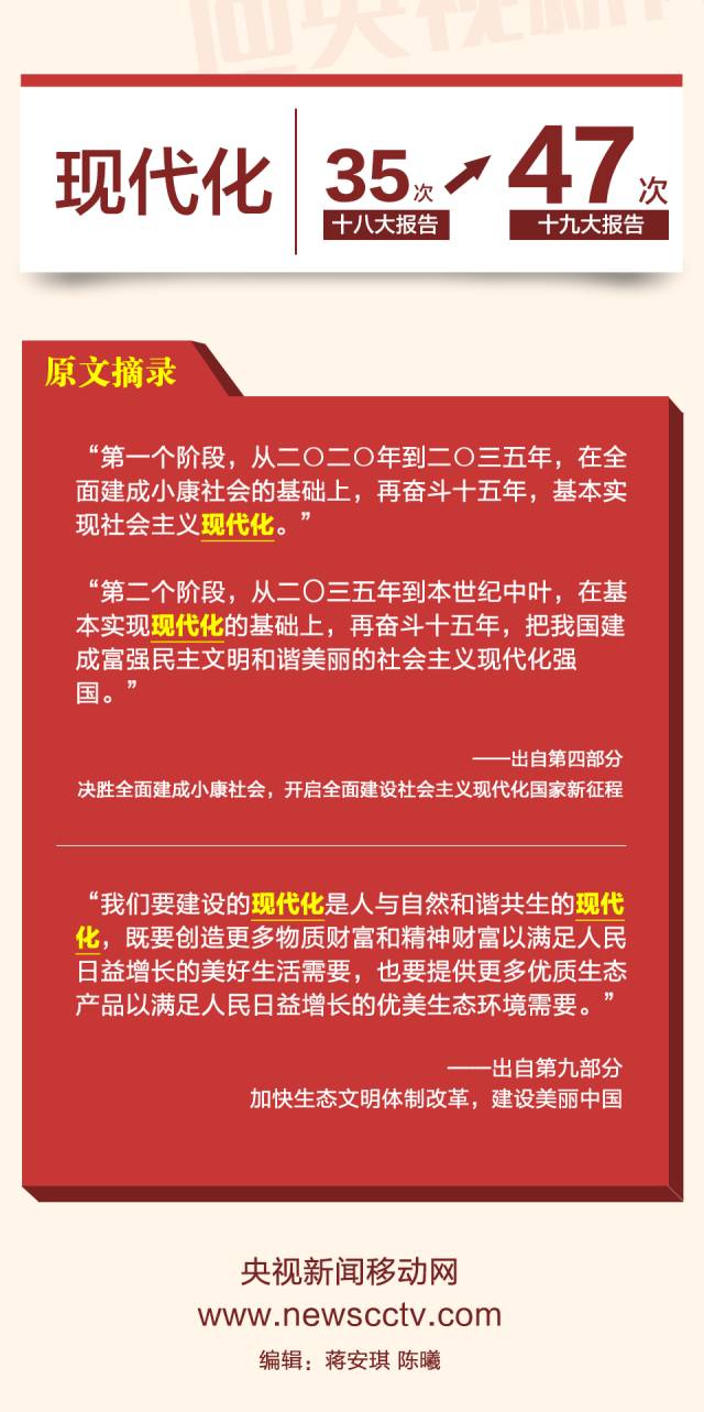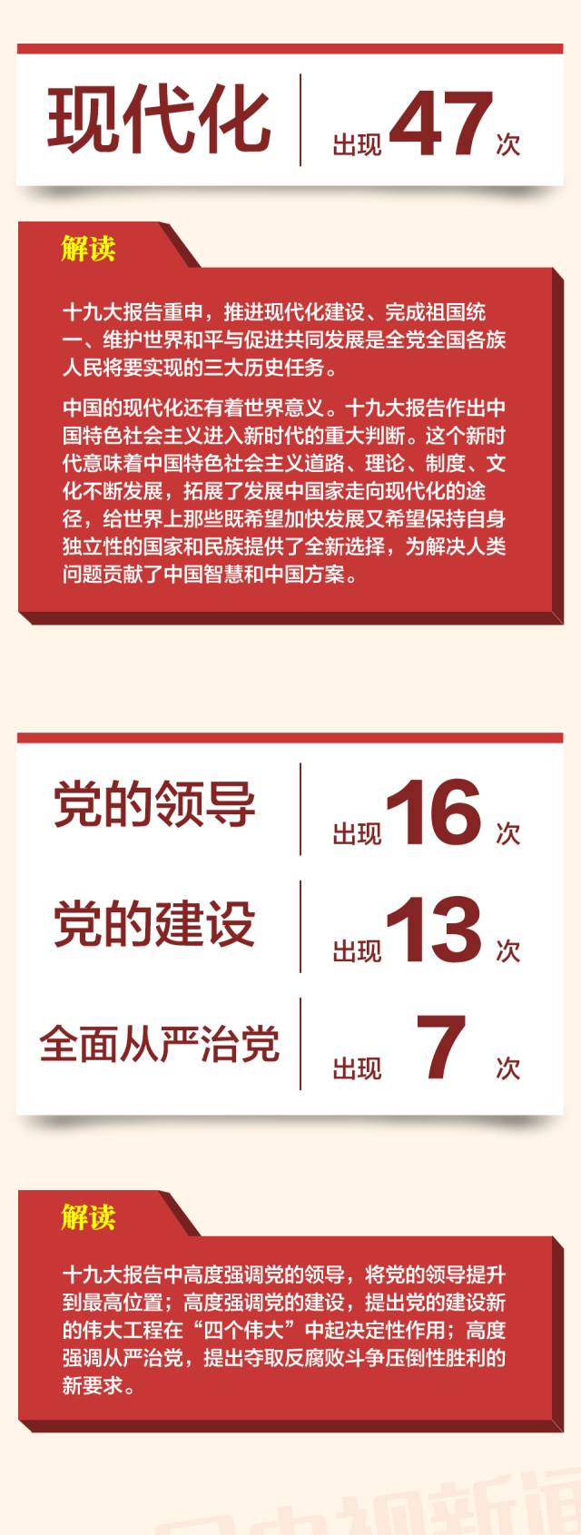 十九大報告中,許多重要關(guān)鍵詞被反復(fù)提及!靶聲r代”一詞首次出現(xiàn)在報告中,出現(xiàn)頻率也達(dá)到了30余次。此外,“中國特色社會主義”、“現(xiàn)代化”、“黨的領(lǐng)導(dǎo)”等詞也在報告中占據(jù)了重要的位置。