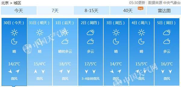 隨著本輪冷空氣影響結(jié)束,明后天北京將出現(xiàn)短暫回暖,最高氣溫將回升至18℃左右。但本周弱冷空氣影響頻繁,氣溫還將出現(xiàn)波動(dòng)。