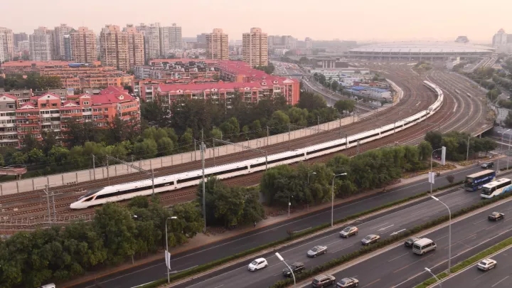 9月21日,一列“復(fù)興號(hào)”列車駛出北京南站。新華社記者 李賀 攝