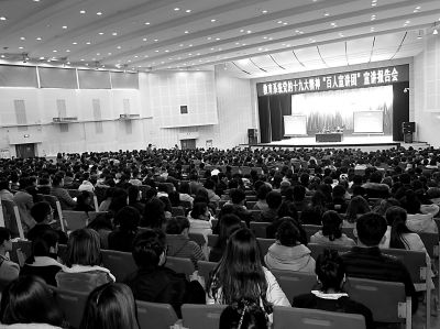 沒有空座,學(xué)生們便擠在報(bào)告廳過道里聽;聽說來了專家,要求進(jìn)現(xiàn)場(chǎng)聽報(bào)告的師生人數(shù)劇增,學(xué)校不得不將地點(diǎn)換到最大的報(bào)告廳……連日來,由教育部黨組書記、部長(zhǎng)陳寶生任團(tuán)長(zhǎng),教育部黨組成員、中管高校黨委書記、部分教育系統(tǒng)十九大黨代表、地方黨委教育工作部門負(fù)責(zé)同志及數(shù)十名高校哲學(xué)社會(huì)科學(xué)專家等組成的“百人宣講團(tuán)”奔赴全國(guó)各地宣講,在師生中掀起了學(xué)習(xí)十九大精神的熱潮,也由此展開了一幅寫好教育奮進(jìn)之筆行動(dòng),把習(xí)近平新時(shí)代中國(guó)特色社會(huì)主義思想轉(zhuǎn)化為優(yōu)先發(fā)展教育事業(yè)的生動(dòng)畫卷。