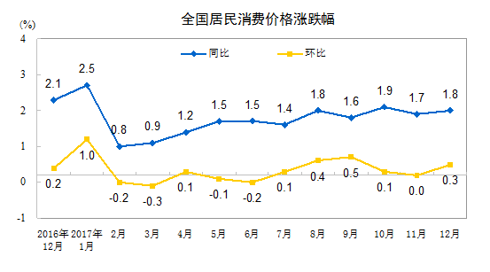 2017年12月份,全國居民消費價格同比上漲1.8%。其中,城市上漲1.9%,農(nóng)村上漲1.7%;食品價格下降0.4%,非食品價格上漲2.4%;消費品價格上漲1.1%,服務價格上漲3.0%。