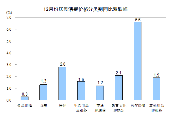 12月份,其他七大類價格同比均上漲。其中,醫(yī)療保健、居住、教育文化和娛樂價格分別上漲6.6%、2.8%和2.1%,其他用品和服務、生活用品及服務價格分別上漲1.9%和1.6%,衣著、交通和通信價格分別上漲1.3%和1.2%。