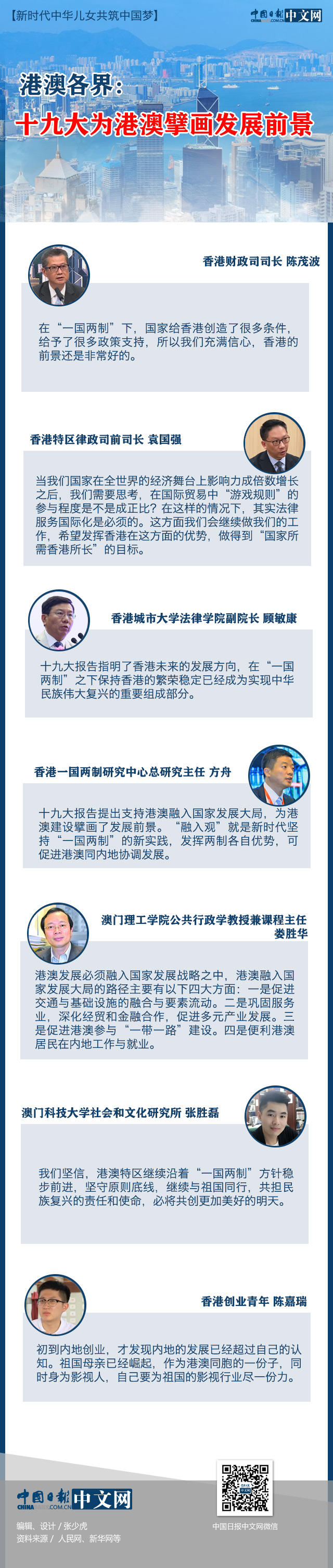 回歸祖國以來,港澳依托祖國、面向世界,“一國兩制”在港澳的實踐取得了舉世公認的成功。十九大報告明確指出,香港、澳門發(fā)展同內(nèi)地發(fā)展緊密相連,支持香港、澳門融入國家發(fā)展大局。港澳各界表示,十九大為港澳建設(shè)擘畫發(fā)展前景。
