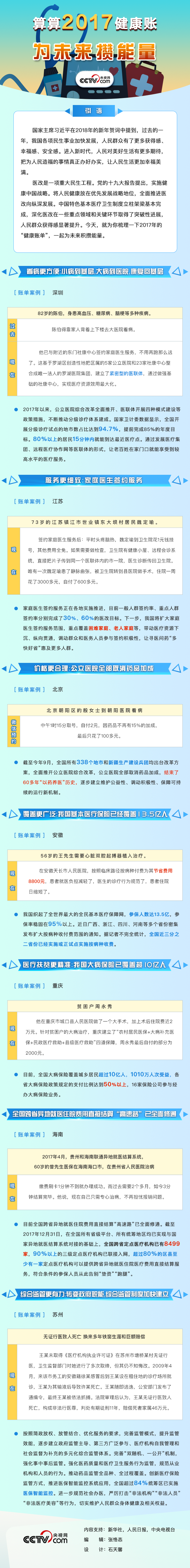 醫(yī)改是一項重大民生工程。黨的十九大報告提出,實施健康中國戰(zhàn)略。將人民健康放在優(yōu)先發(fā)展戰(zhàn)略地位,全面推進醫(yī)改向縱深發(fā)展。中國特色基本醫(yī)療衛(wèi)生制度立柱架梁基本完成,深化醫(yī)改在一些重點領域和關鍵環(huán)節(jié)取得了突破性進展,人民群眾獲得感顯著提升。今天,就為你梳理一下2017年的“健康賬單”,一起為未來積攢能量。