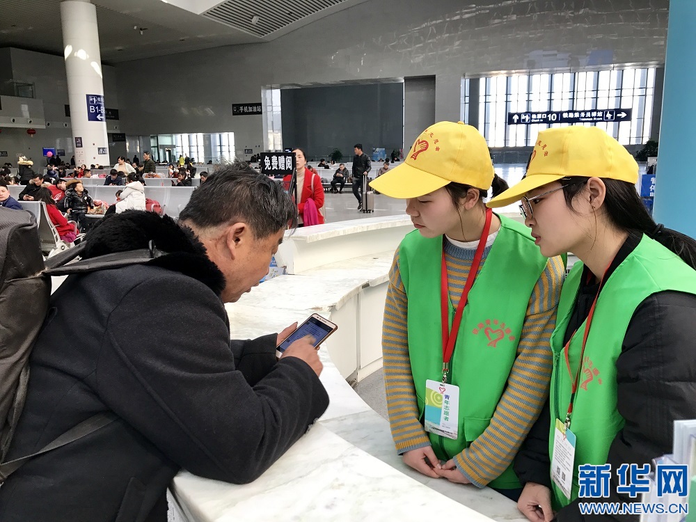 南昌火車站志愿者為前來咨詢的旅客提供幫助。新華網(wǎng)(楊益民 攝)